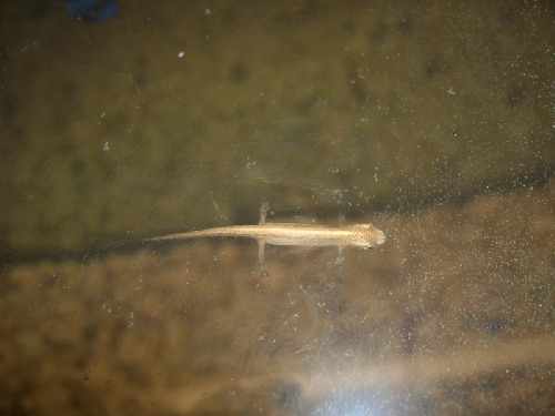 Ich sah eben eine kleine Bewegung an der Wasseroberfläche und schaute genauer hin. Da schwimmt da doch ein Babylurch/Molch oder ähnliches drinnen. Wie kann der da rein gekommen sein und kann ich den da lassen? Oder soll ich ihn raussetzen?