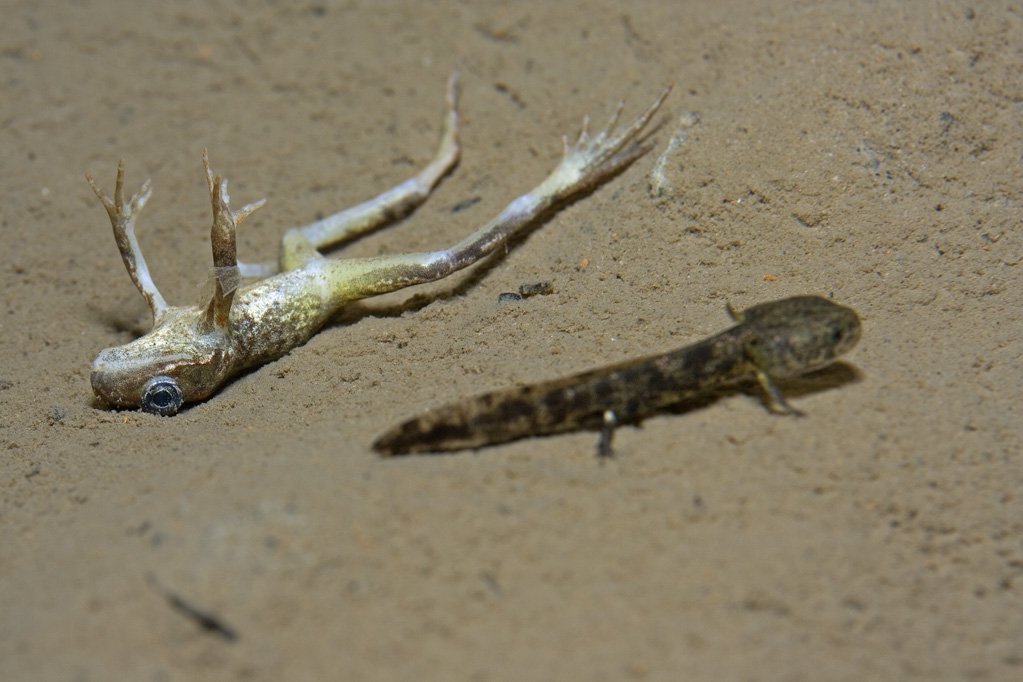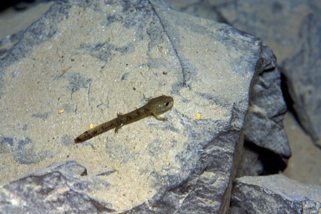Normalerweise entwickeln sich aus dem abgesetzten Nachwuchs binnen einem Vierteljahr Jungsalamander, doch hier in diesem Bergwerk bei Mangelernährung und in völliger Dunkelheit ist alles anders.