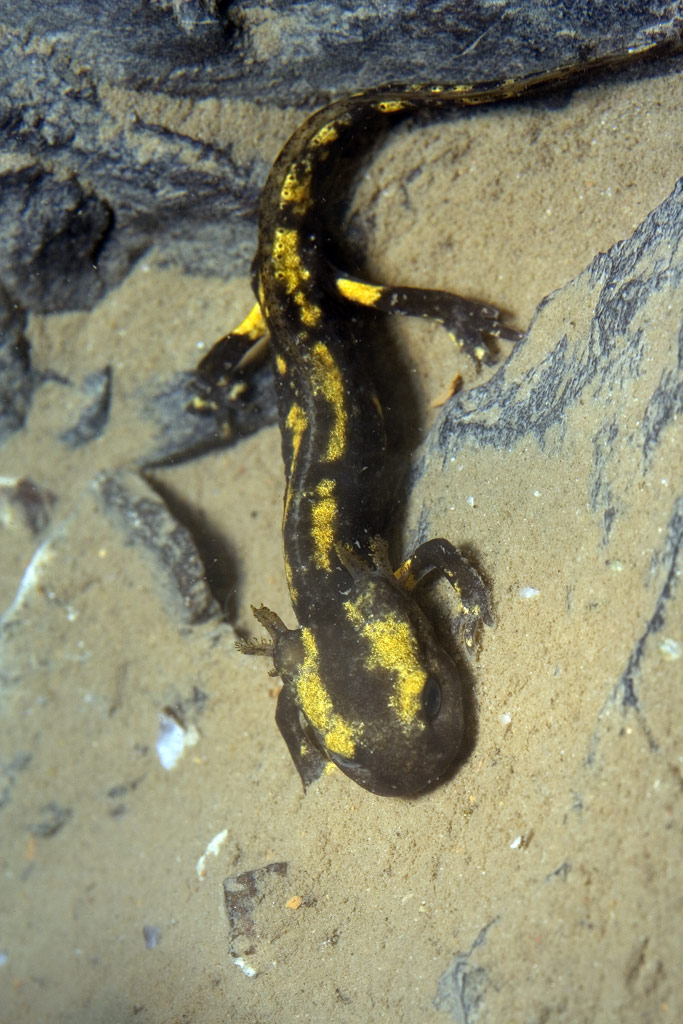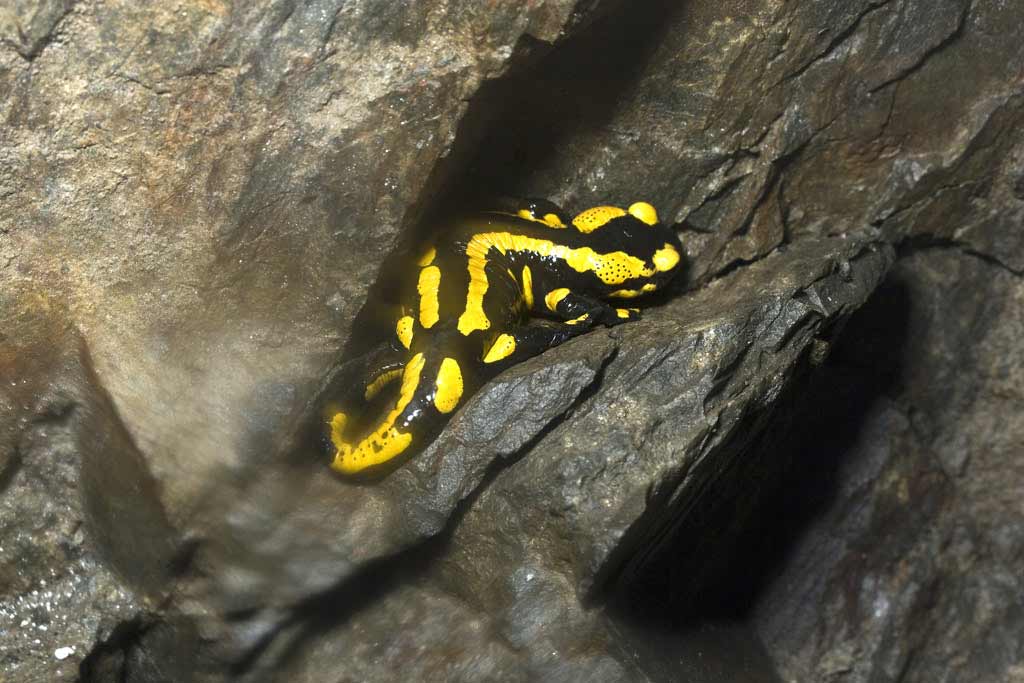 Ein großer Feuersalamander lag in einer Felsnische am Gesenk und scheint auf das Absetzen der neuen Brut zu warten.