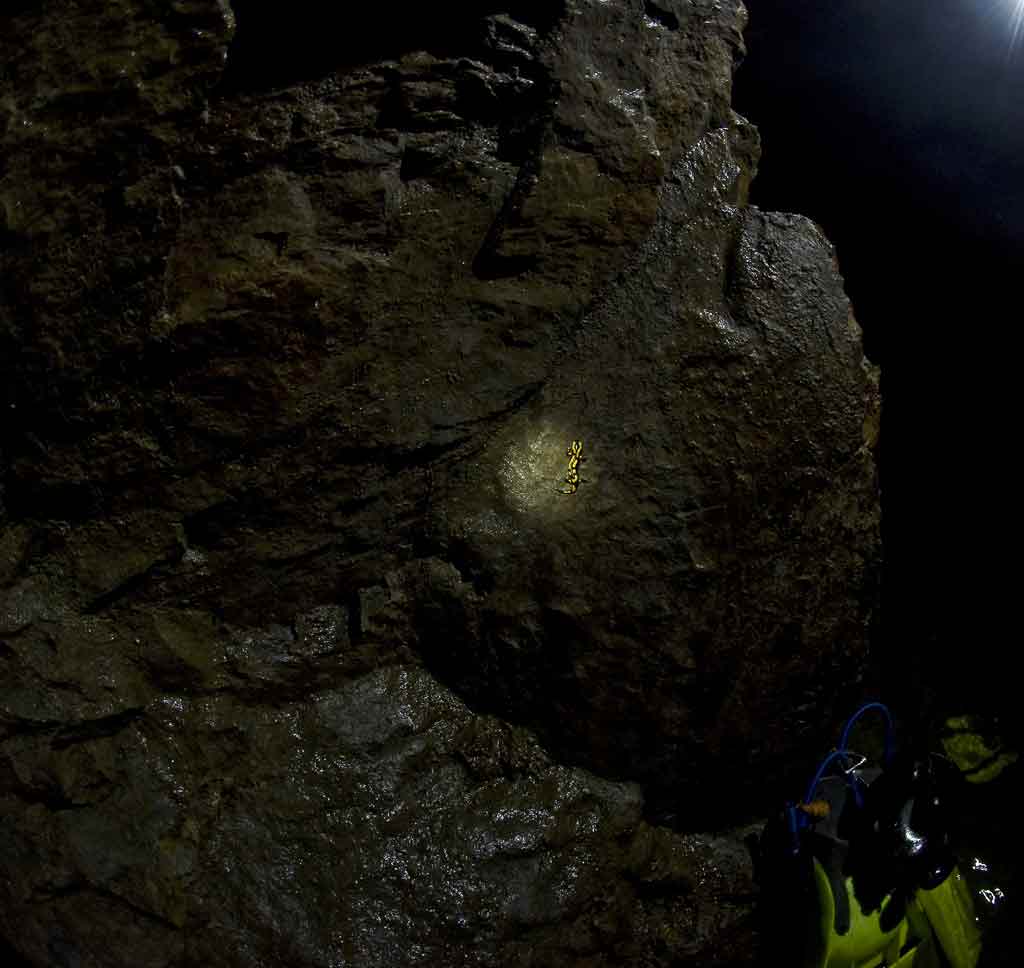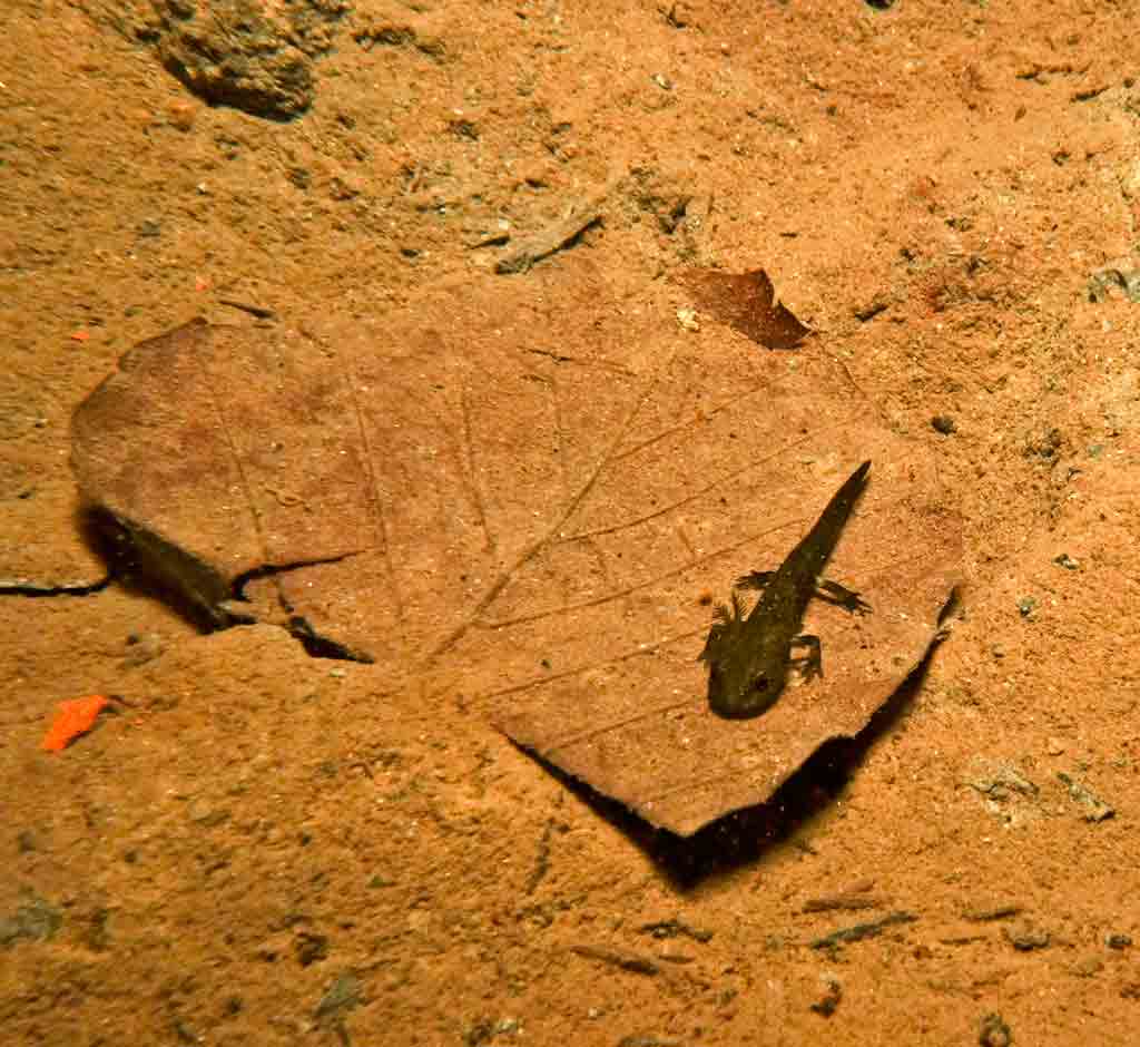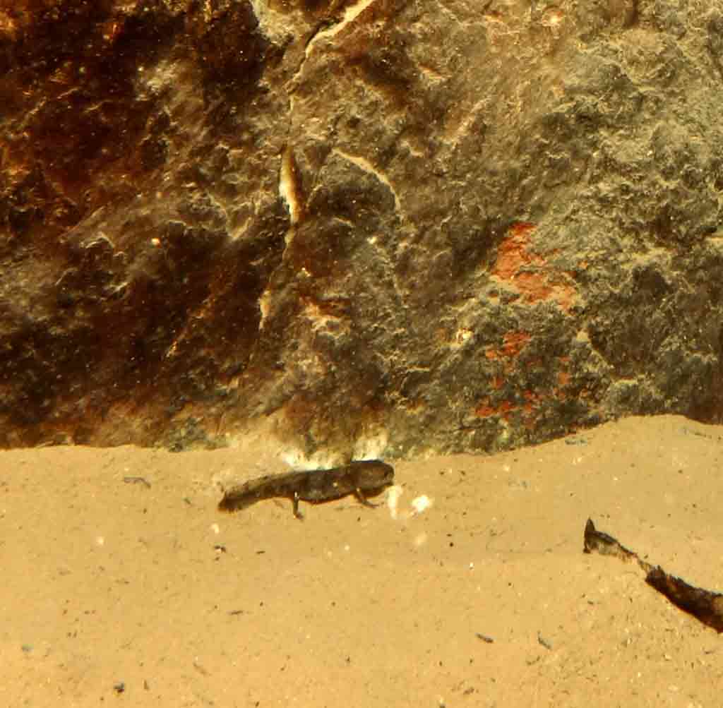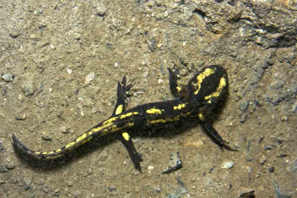 Bei einem Höhlentauchgang im französischen Department LOT, in dem es viele unter Wasser stehende Kalksteinhöhlen gibt, konnten wir eine Entdeckung dokumentieren. In der "Truffe", einer viel von Spezialisten betauchten flachen Höhle entdeckte mein Tauchbegleiter auf dem Rückweg ca. 50m vor dem Ausgang einen völlig umgewandelten Feuersalamander. Ich hatte keine ideale Ausrüstung für die Doku dabei, aber ich denke, man erkennt die wichtigsten Dinge. Wie er dorthin gekommen ist, bleibt unklar. Er schwamm jedenfalls und bewegte sich völlig normal. Möglich ist, dass er sich im Pool (der aber auch von Fischen bevölkert wird), metamorphosiert ist und mit Tauchern in die Höhle verdriftet wurde. Der Eingang ist für Menschen zwar ziemlich eng, aber nicht für Feuersalamander. Vorher hatten wir schon Rotfedern und später noch eine große Ochsenfroschlarve in der Höhle gefunden.