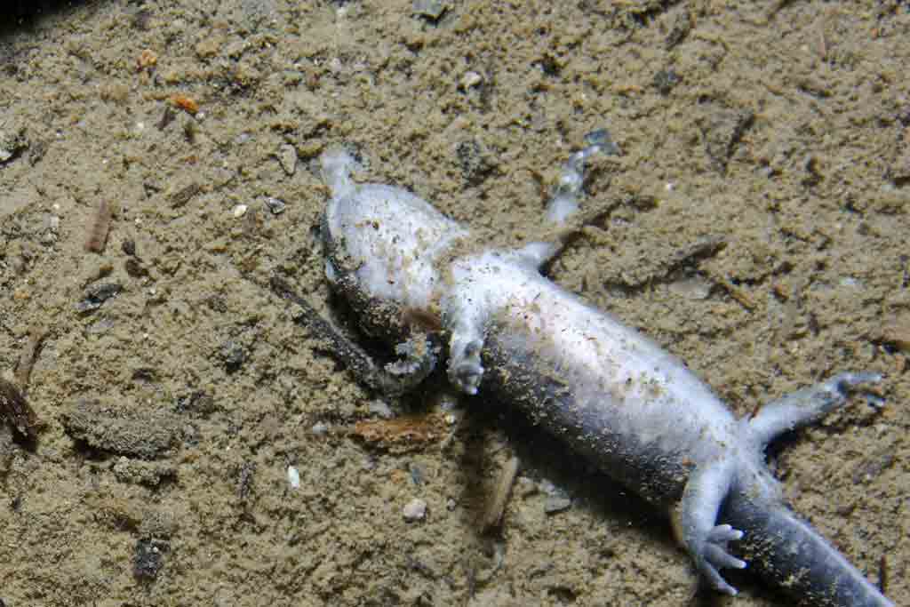 zu den Feuersalamandern im Bergwerk zu kommen. Es gab weit über 25 verendete