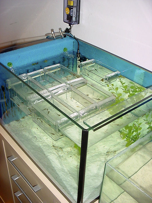am geeignetsten erscheinen mir die Ablaichkästen mit sehr schmalen Schlitzen ausschließlich am Boden. Die Netzkästen habe ich gar nicht erst eingesetzt, die Kästen mit seitlichen Schlitzen "verlieren" recht schnell Artemien ... bei den Kästen mit Schlitzen ausschließlich im Boden gelingt die Fütterung der Mini-Lotls recht gut. Erstaunlicherweise macht die Breite der Bodenschlitze auch hier noch einen erheblichen Unterschied: Im Kasten mit extrem schmalen Schlitzen [müssten ca 1 mm sein], sind die Mini-Lotls schon ca 1 cm länger als in den Kästen mit etwas breiteren Schlitzen [ca 2-3 mm].
