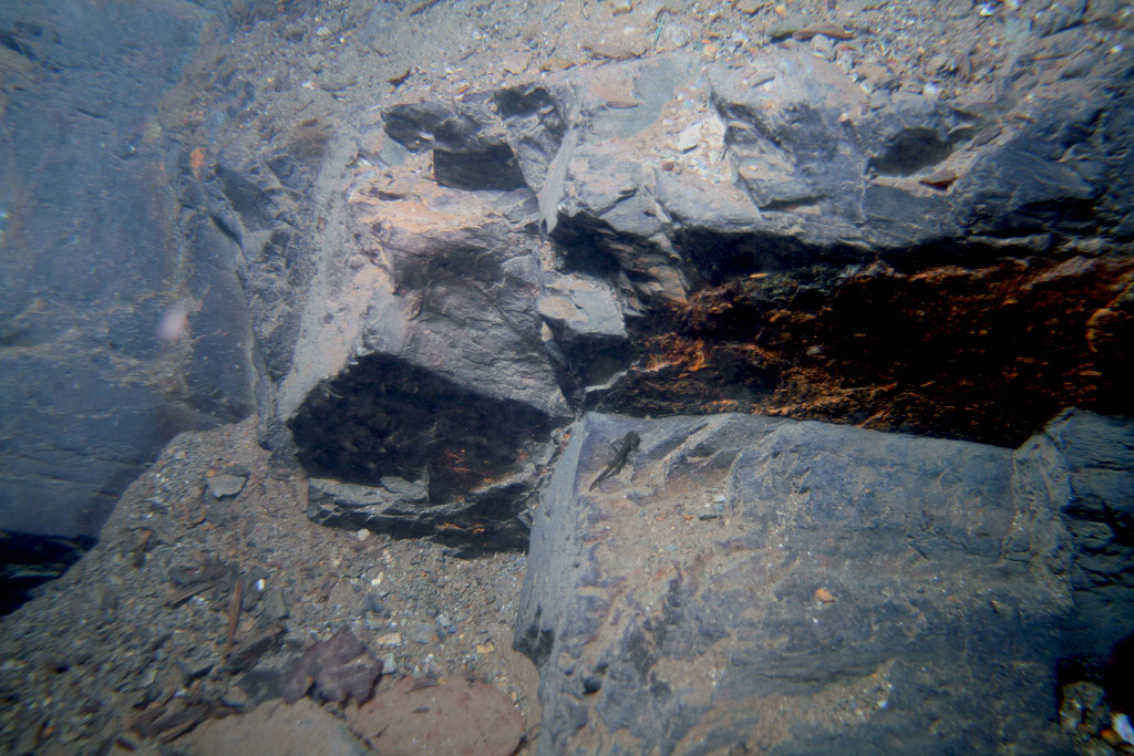 Die größte Überraschung erwartete den Taucher aber am Ende des Abstiegs im Gesenk auf 22m. Hier saß ein lebendes! ausgewachsenes Tier. (Ich wollte das deshalb erwähnen, weil ich vor fast einem Jahr an dieser Stelle ein frisch ertrunkenes Adultus gefunden habe.)