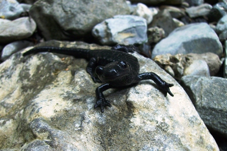 Kein schöner Anblick, aber wo tote Tiere sind müssen auch lebende sein. Nachdem der Tag nichts gebracht hatte machte ich mich Nachts bei leichten Nieselregen auf den Weg und es sollte sich lohnen. Auf ca. der hälfte des Weges lief ein fast Mausgoßes schwarzes etwas in den Wald. Ein Alpensalamander!!!