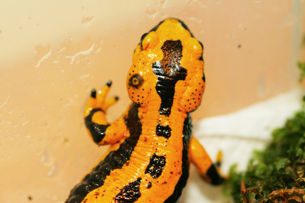 Meine Haltungsbedingungen stehen im Thread zum Salamanderhimmel ziemlich ausführlich beschrieben. Verhaltensauffälligkeiten zeigt Flamagor keine, frisst von allen am besten und ist entsprechend der am besten genährte. Ich hab ihn jetzt erst einmal von den anderen getrennt und hab ihn in eine Faunabox mit Zewa, etwas Moos, Rinde und einer kleinen Wasserschale gesetzt.