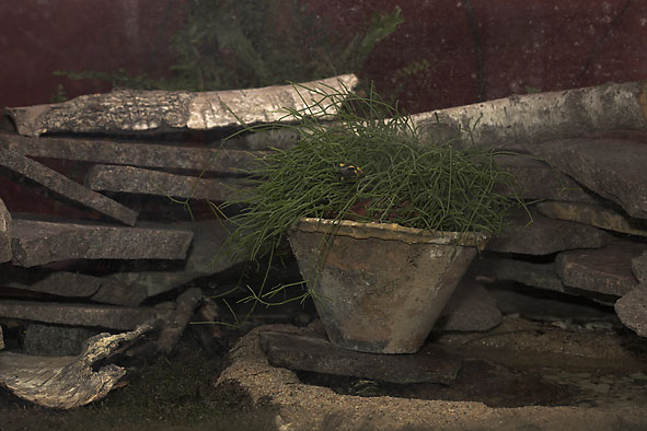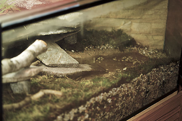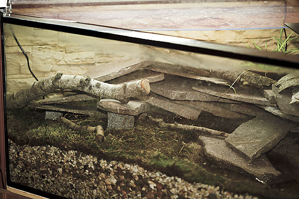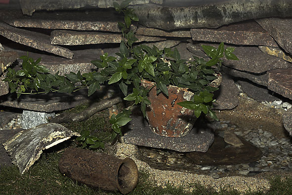 In mein Feuersalamander-Terrarium [Fünfeck] habe ich etwa 100 kg Kies [von grob bis fein] als Grundlage eingebracht und mit Moos belegt. Eine kleine Bachschale bildet so etwas wie ein Stückchen Bachlauf nach. Zwei Pumpen sorgen für Nachschub im "Bach" und saugen permanent das Wasser durch den Kies.