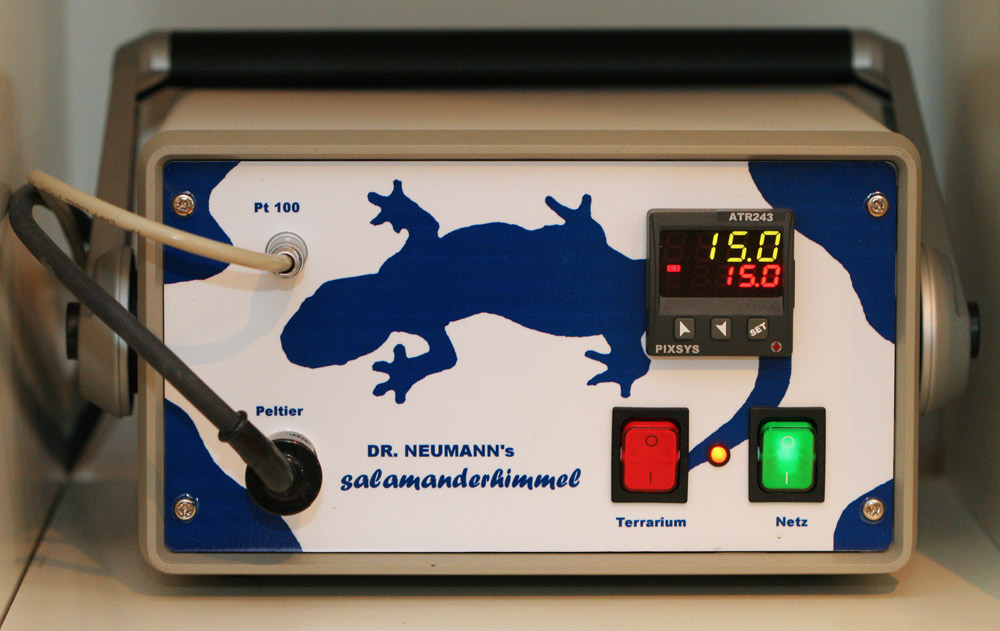 Das besondere daran ist, dass unter dem Boden aus Aluminium eine Kühlung eingebaut ist, die über Peltierelemente funktioniert (Bild 1). Der Boden ist dann mit gut kälteleitenden Schieferplatten ausgelegt, so dass ich zumindest ein paar Zentimeter übder dem Boden und in den unteren Verstecken die Temperatur halten kann, die ich einstelle (Bild 2). Die Temperaturabsenkung geht ziemlich schnell, so dass auch ein guter Tages- Nachtzyklus mit nächtlicher Temperaturabsenkung zu realisieren ist.