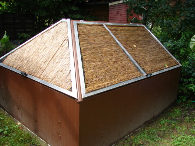 Auf das Abdeckgitter habe ich Schilfrohrmatte befestigt, wurde nötig weil gerade im Frühjahr, wenn die angrenzenden Bäume noch kein Laub haben, die Sonne doch die Oberfläche ziemlich ausgetrocknet hat.