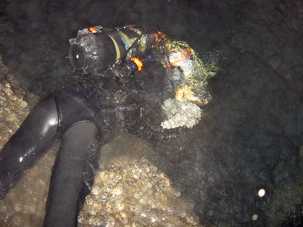 Außerdem galt es eine neue Ausrüstung, wie sie gern von Tec-Tauchern genutzt wird, zu testen. Auch wenn die Wasserlage hervorragend ist, überwiegen die Nachteile. Das Gesamtpaket mit integriertem Blei ist nun so schwer, dass man es nur mit erheblich mehr Mühe durch das Mundloch hieven kann. Aber den Versuch war es wert.