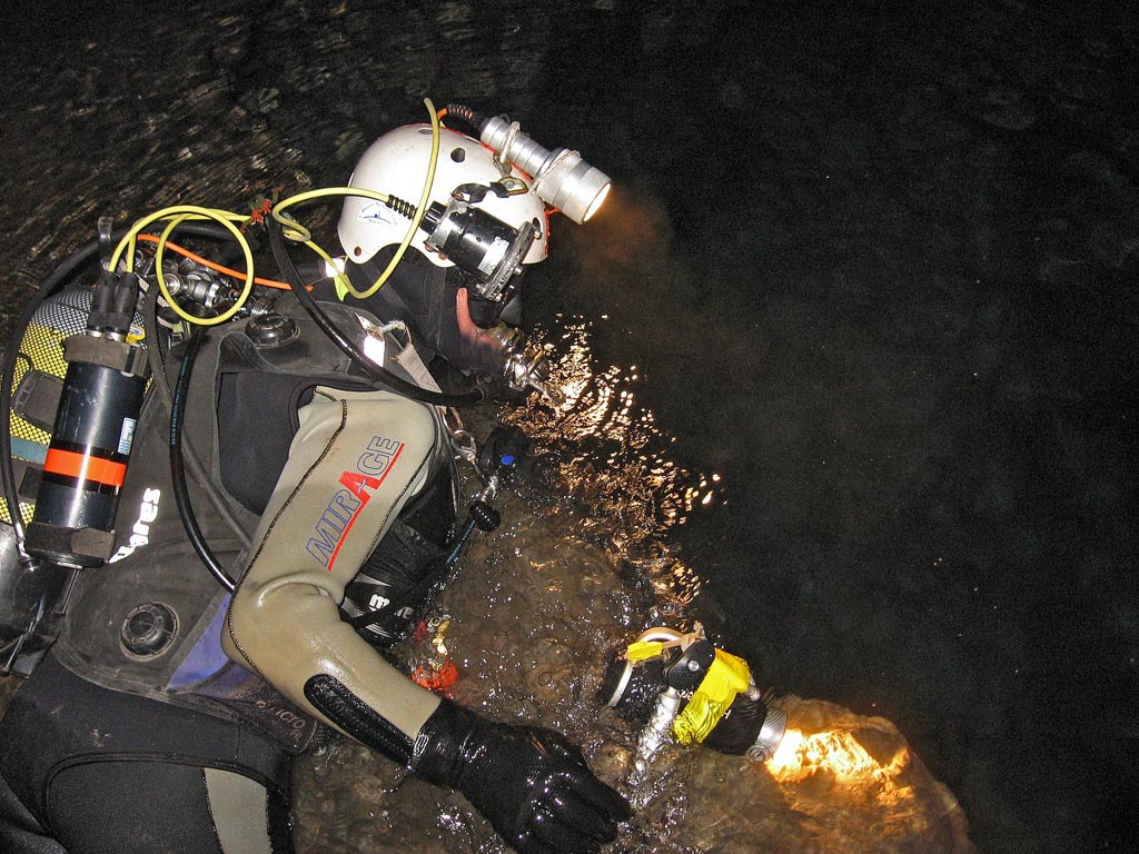 Außerdem galt es eine neue Ausrüstung, wie sie gern von Tec-Tauchern genutzt wird, zu testen. Auch wenn die Wasserlage hervorragend ist, überwiegen die Nachteile. Das Gesamtpaket mit integriertem Blei ist nun so schwer, dass man es nur mit erheblich mehr Mühe durch das Mundloch hieven kann. Aber den Versuch war es wert.