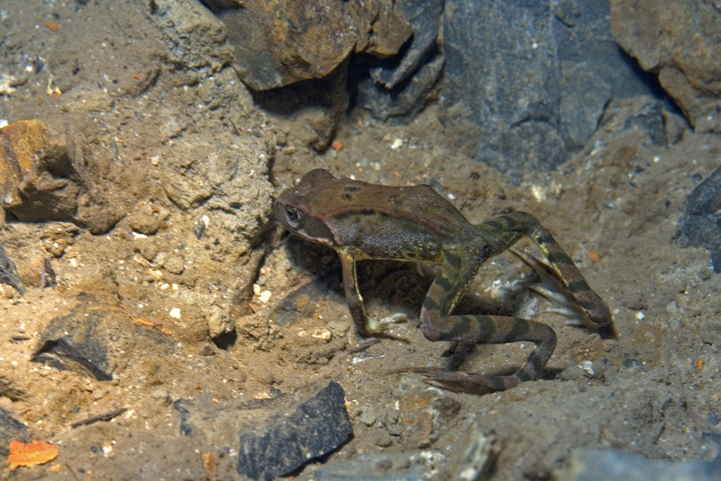 Einige Gäste hatten sich inzwischen bis zum Ende des Stollens unter Wasser verirrt: Grasfrösche, Erdkröten und eine Nacktschnecke.