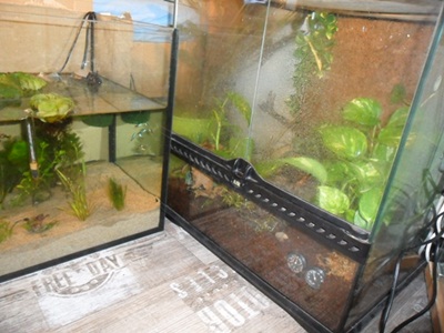 Der Waldsteiger ist in ein 50x50x50cm Terrarium und die beiden Amerikanischen Laubfrösche sind in einen 80x60x60cm Terrarium (lxhxt).