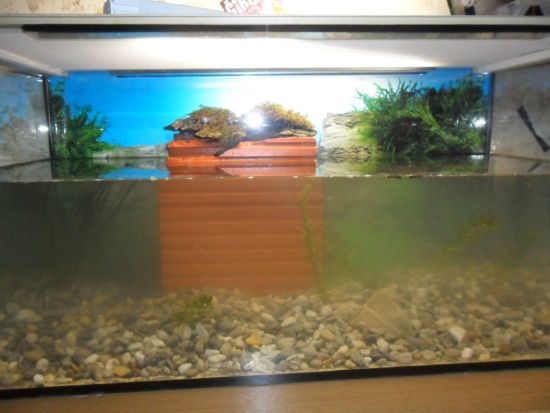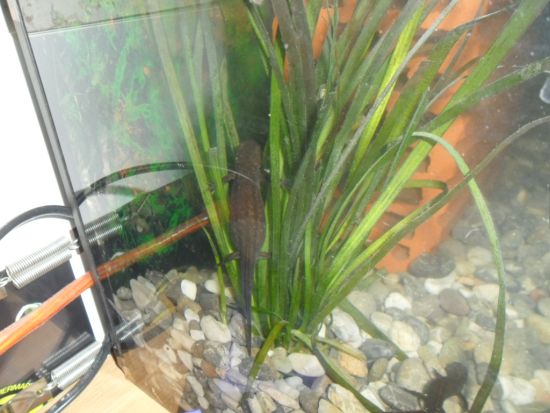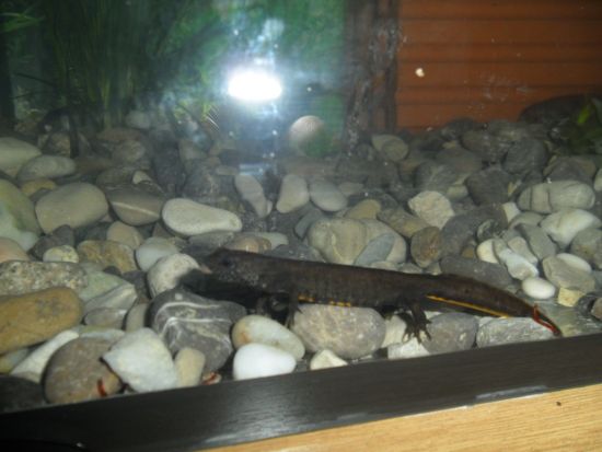 Hallo hab seit dem Wochenende ein neues Aquarrium(80x40x40) für meine Triturus Carnifex.Daweil hab ich 2 Tiere aber es sollen am kommenden Wochenende noch 3 ÖNZ dazu kommen darum jetzt auch schon das grössere Aqu.Nun ja hab normalen Flusskies aus den Baumarkt dazu noch Wasserpest und eine Vallisneria Spiralis.Den Landteil hab ich mit einen Hohllochziegel geschaffen der mir auch ein Tunnelsystem zur verfügung stellt.Wird von den Tieren auch genutzt konnt ich schon beobachten.Oben drauf noch etwas Rinde und Moos das ich auch 1xtägl. besprühe.1xwöchentlicher Wasserwechsel genügt meiner Meinung nach aber das bleibt jedem selbst überlassen zwecks filterung.Den Deckel hab ich mir selbst gebastelt aus Holzstaffeln und normalen Fliegengitter.Die Leuchte hab ich auch aus dem Baumarkt für 15 Euronen glaub ich hat 15Watt und is so ne Küchenunterbauleuchte also keine Wärme und nur für die Pflanzen.Hier die Fotos Mfg ANgelo