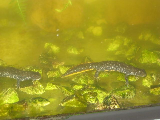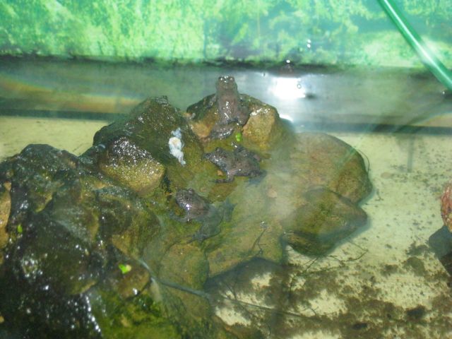 - Geburtstag war heute bei den Gelbbauchunken, die ersten Larven sind aus dem Ei und hängen an den Scheiben.