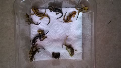 mein bernardezi Weibchen hat jedes Jahr erst einen Schwung unbefruchteter Eier abgesetzt und dazu meist noch 1-2 Larven, die trotz Kiemen dann kurz darauf aus dem Wasser krabbelten. Dazu dann immer noch 4-6 fertig entwickelte Jungtiere, die sich natürlich schnell im Moos verkrochen haben.