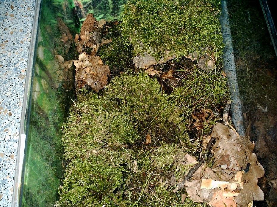 Nun mein Problem: Ich habe den beiden ein Faunarium eingerichtet mit Korkstücken und Moospolstern zum Verstecken. Futter bekommen sie alles was auf meiner Pferdewiese so rumkrabbelt und noch Heimchen, Grillen usw.