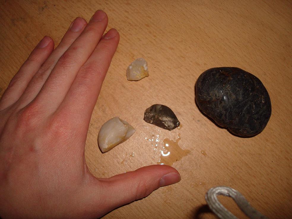 Im Anhang ein Foto von Bruchstücken der Steine, zum Größenvergleich ein unbeschädigter Stein und meine Hand. Das Quarantänebecken steht nicht hier, deswegen kann ich noch kein Foto vom Tier anhängen.
