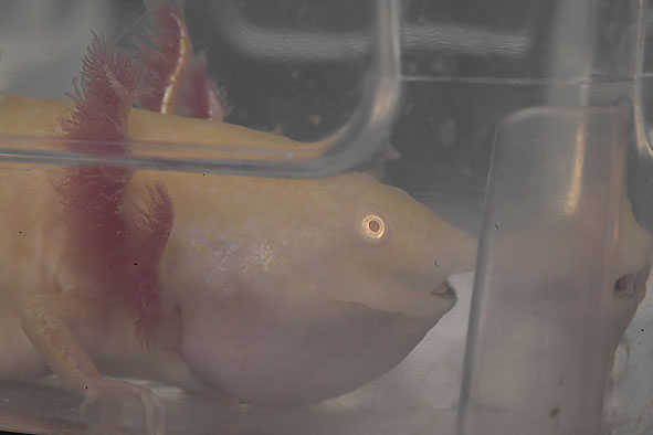 Erst nach über einer Stunde hat es aufgehört und ist in einer Ecke sitzen geblieben. Es war weiterhin sehr gestresst, die Kiemen rot, deutlich sichtbare Adern im Saum und eingerollter Schwanz. Am nächsten Tag ist es kontinuirlich im Kreis gekrochen. Nicht wie üblich mit Abstand zwichen dem Körper und dem Boden, sondern weiterhin auf den Boden gepresst, hat es sich im Kreis durch seinen Aquarienbereich gerobbt. Zwischendurch ist es stehen geblieben, hat den Kopf so angewinkelt, als würde es den Kopf auf die Brust legen wollen und hat mehrere Male gehustet. Dann robbte es wieder einige Dezimeter, bis es wieder stoppte um zu husten. Ich habe es dann in ein Quarantänebecken gesetzt, wo es seitdem in einer Ecke hockt und hustet. Alle Knochen und Gelenke scheinen intakt zu sein, ich kann auch keine Blutergüsse oder Ähnliches erkennen. Fressen tut es normal, aber wenig. Seitdem hat sich nichts an den roten Kiemen, den Adern im Saum, dem eingerolltem Schwanz und dem Husten geändert. Es lässt sich berühren und ist auch sonst wieder ruhig im Verhalten, aber es gibt deutliche Anzeichen für irgendeine Erkrankung oder vielleicht innere Verletzung.