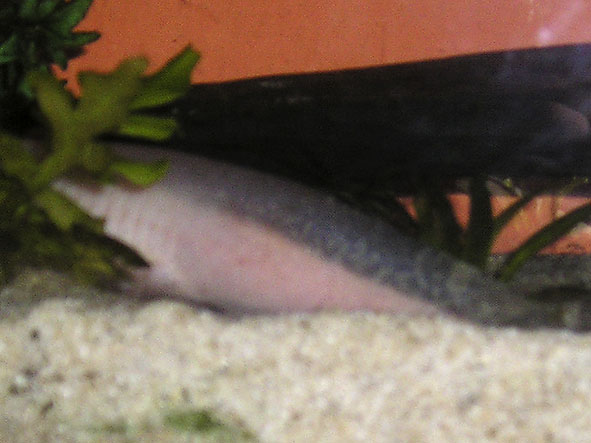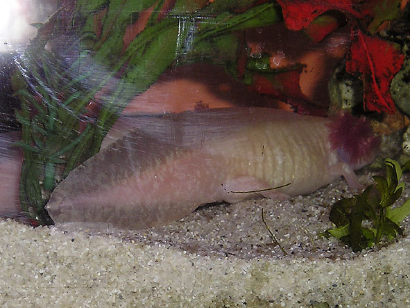 Axolotl kann nicht mehr richtig schwimmen, roter scwanz, weißer punktartiger Belag
