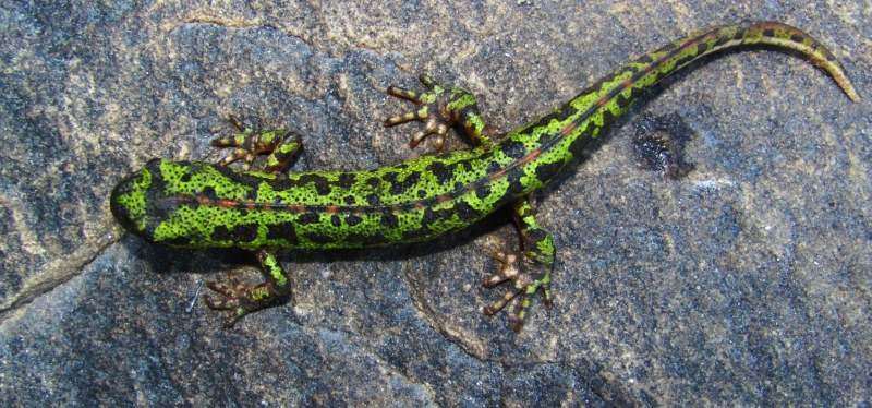 Übrigens handelt es sich hierbei eindeutig und zu 100% um ein Männchen. Die Linie auf dem Rücken ist nicht orange sondern rötlich/orange/bräunlich (=hell) - schwarz gestrichelt. Zudem sieht man auf den Schwanzseiten einen weißen Strich, was das Tier als Männchen um die Balzsaison herum indentifiziert. Wenn du das Tier umdrehst wirst du zudem wohl eine kugelige, dunkle Kloake sehen
