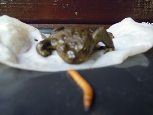 Folgendes Problem. Er ist nicht mobil - er verharrt regelrecht in seiner Position. Sein rechtes Beinchen wird irgendwie nicht wirklich besser. Er kann greifen, wenn ich ihn füttere. Ansonsten "zieht" er es nach. Er bewegt sich sowieso so gut wie gar nicht; aber wenn... ohne rechtes Bein. Er wird aber deutlich kräftiger. Anfang lag er platt wie ne Flunder da, keine Regung... gar nix. Zwangsfütterung... tja, den Mehlwurm, den ich ihm am ersten Tag reingeschoben habe, den hat er den halben Tag im Mund behalten. Inzwischen klappt alles hervorragend. Ich mache seinen Mund auf; Heimchen o.ä. rein u. er schluckt ganz brav. Zieht dabei auch den Augapfel vom gesunden Augen ganz typisch ein. Auch meine Finger hält er manchmal für ein Weibchen