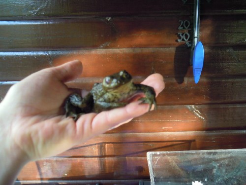 Vielleicht auch Bakterien. Seine Verletzungen wirken auf mich schon entzündet. Unter der milchrigen Hornhaut beim Auge sehe ich schön gerötete Stellen, ebenso am rechten Ellenbogen. Kann man einer (geschwächten) Erdkröte überhaupt Blut nehmen?