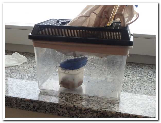 Diese Idee war gewissermaßen der Startpunkt für eine Methode, die ich seitdem praktiziere, und die nun so aussieht, dass ich die für die Zucht vorgesehenen Drosophila in einem kleinen Plastikaquarium halte (Foto2), in dem sich ein Gefäß mit Futterbrei befindet, das zur Vermeidung von Austrocknung mit einem NICHT dicht schließenden Deckel abgedeckt ist, und in das die Fliegen ihre Eier absetzen. Alle paar Tage kann ich diesen kleinen Behälter entnehmen und gegen einen frischen auswechseln. Den mit winzigsten Maden befruchteten Nährbrei fülle ich dann in ein gewöhnliches Drosophilaglas, in dem die Maden sich bis zur Reife entwickeln. Der größte Teil der dann schlüpfenden Fliegen wird verfüttert, einige wenige landen dann zur Auffrischung im Zuchtbehälter.