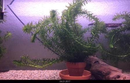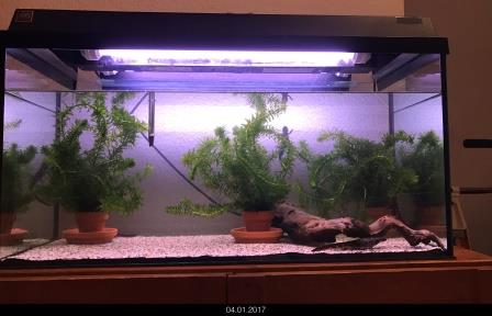 Ich füttere viel Regenwürmer. Die können sich nicht mehr im Kies vergraben. Auch die Reinigung dürfte dann etwas einfacher sein. Die Pflanzen habe ich in kleine Tontöpfe mit Kies gepflanzt. Damit die Töpfe nicht umkippen habe ich mit Silikon an die Töpfe eine kleine Schale geklebt.