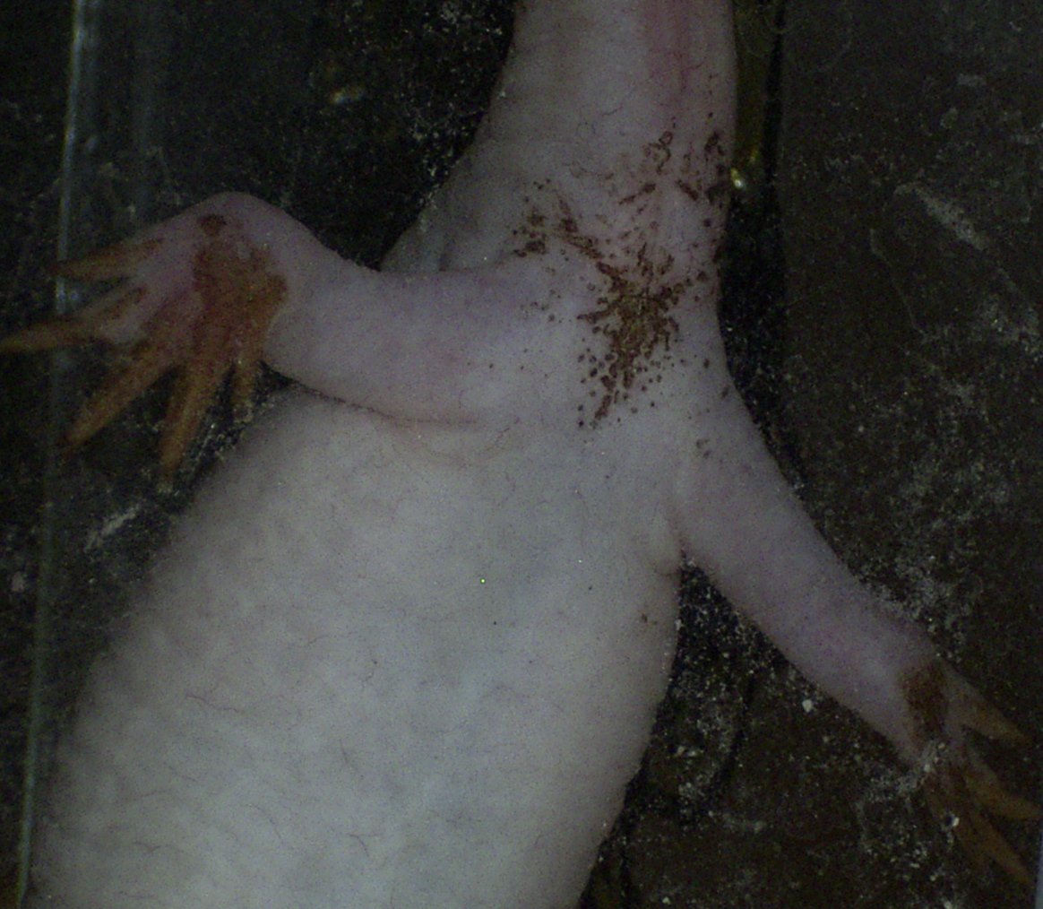 mein Axolotl hat zwischen den Hinterbeinen und an den hinteren Füßen viele kleine schwarze Punkte. Ich weiß nicht genau auf welche Krankheit diese Symptome schließen lassen.