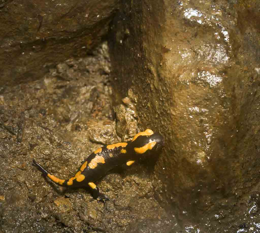 Beim Auftauchen fand ich einen einzigen winzigen fertig entwickelten Feuersalamander in einer Mauernische.