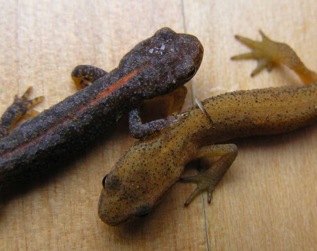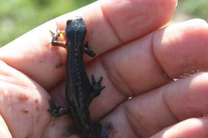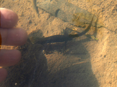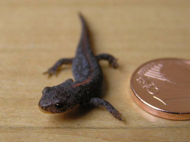 und der Triturus-Nachwuchs vom letzten Jahr... - heute zufällig unterm Laub auf unserer Treppe gefunden :)