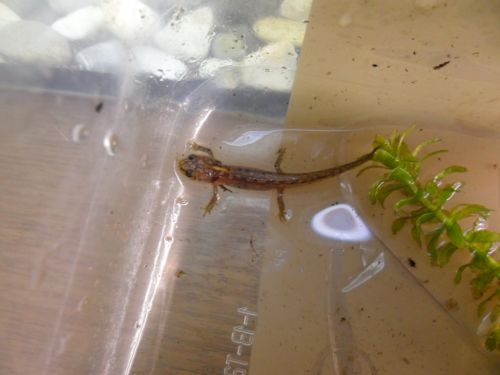 Ausserdem habe ich eine Bergmolchlarve in einem höchstens 5 cm tiefen Rinnsal entdeckt - ich nehme allerdings an, dass diese dort hingespült wurde, anders erklärt sich das für mich nicht.