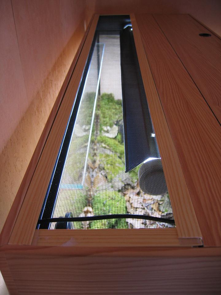 Die hintere Abdeckung habe ich durch eine eigene Konstruktion aus L-Profil (Farbe Kiefer), Power-Tape und Fliegengitter mit entspr. Befestigungsband ersetzt. Ist nicht perfekt geworden (an den Ecken), erfüllt aber zur Zeit seinen Zweck. (Ich hoffe nur die Katzen bleibt mit den Pfoten weg...).