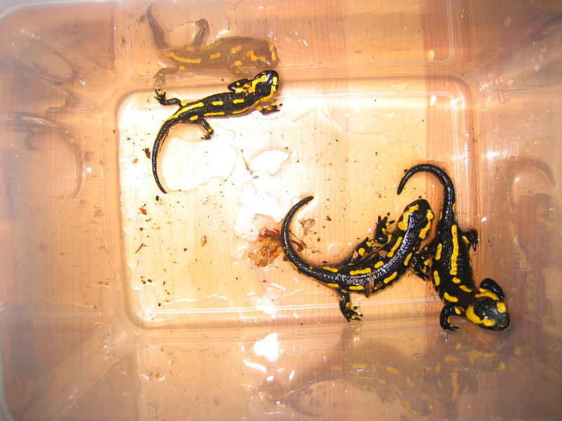 Seit es vor 2- 3 Wochen mal ein paar Tage wärmer war (bis 21 °C im Terrarium, oh je, was mache ich im Sommer) liegen die Salamander häufiger - auch tagsüber - in der Wasserschale, obwohl die Temp. wieder runter sind (16 - 18 °C). Feucht genug ist es auch. Ansonsten sind sie fit.