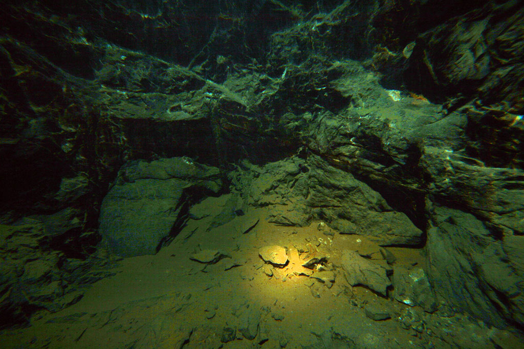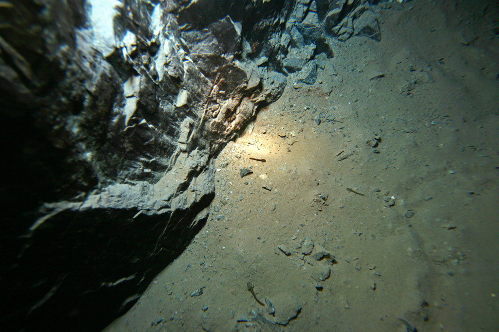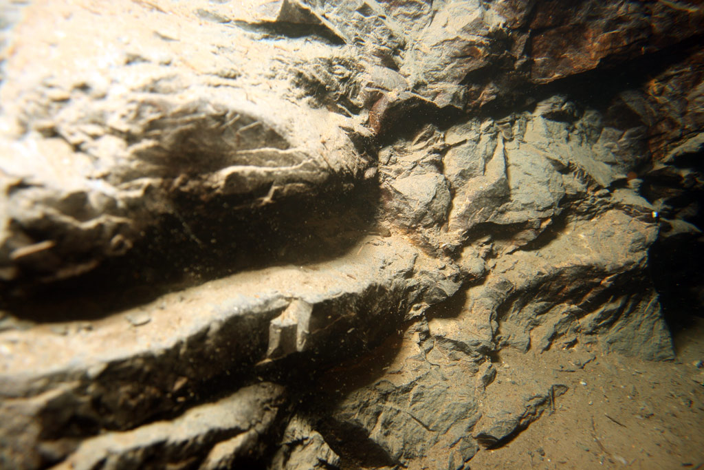 Gleich mit zwei Tauchknappen, die brav das ganze Gerödel bis ans Mundloch geschleppt haben, waren wir schon mal am ersten Haltepunkt angelangt. Der Versehrte krabbelte den Hang mit dem Fotorucksack hinauf und wir waren zufrieden über diese erste Etappe. Ein paar Kleinigkeiten beim Einstellen des Weitwinkelobjektivs und dann sollte es so richtig losgehen.