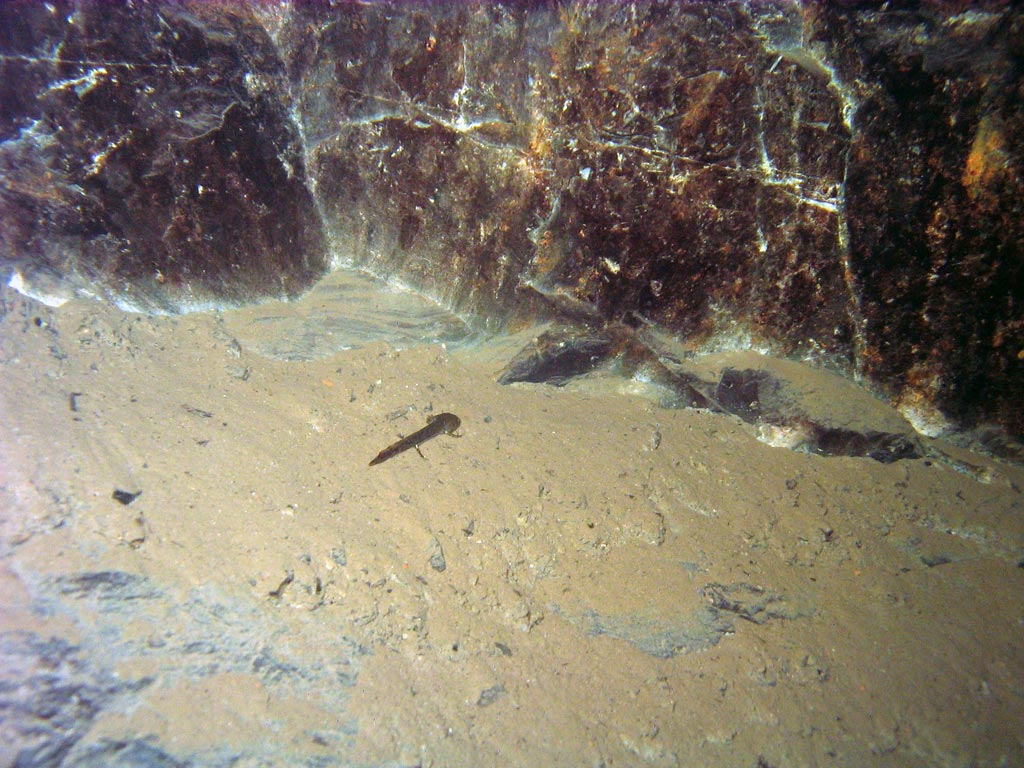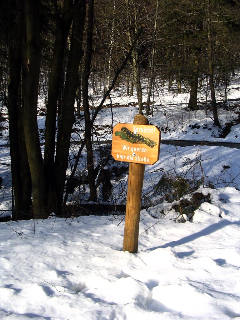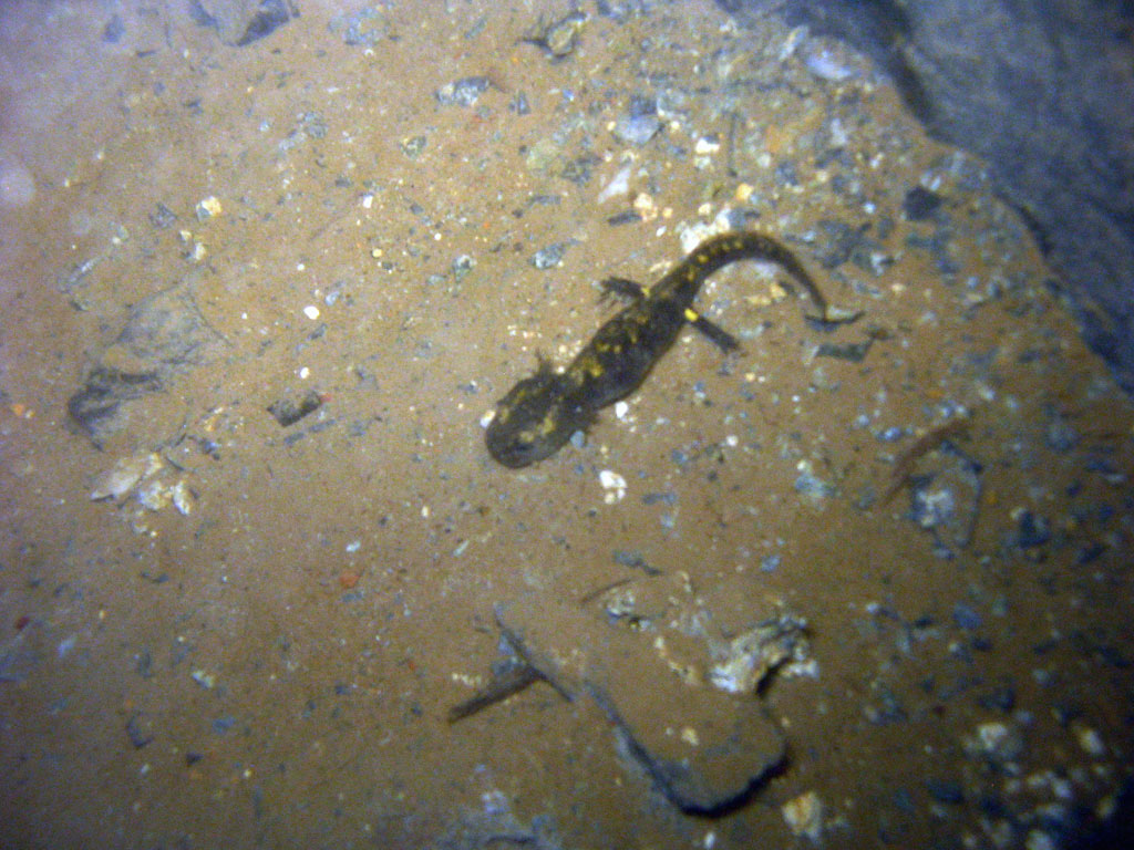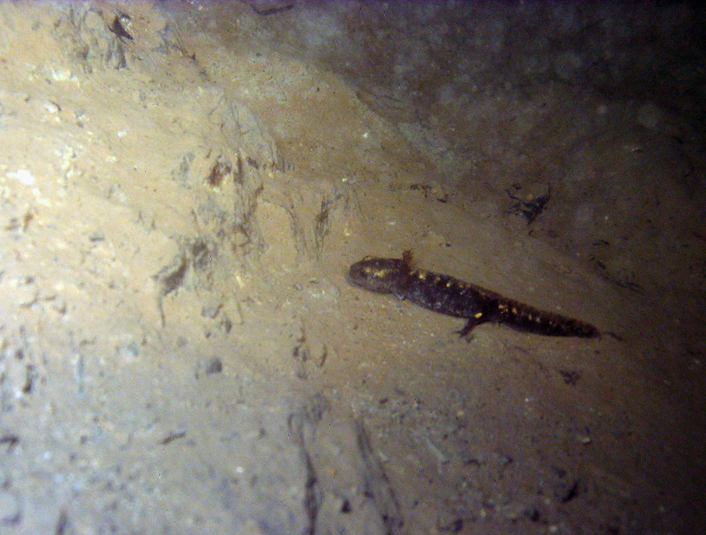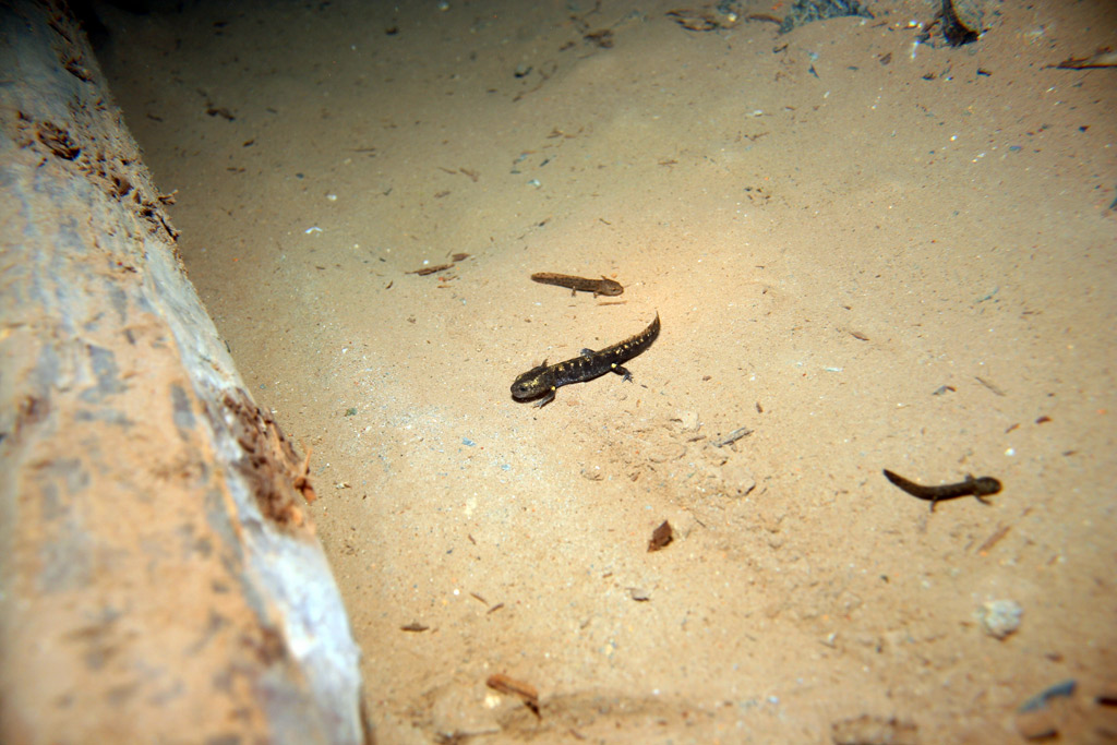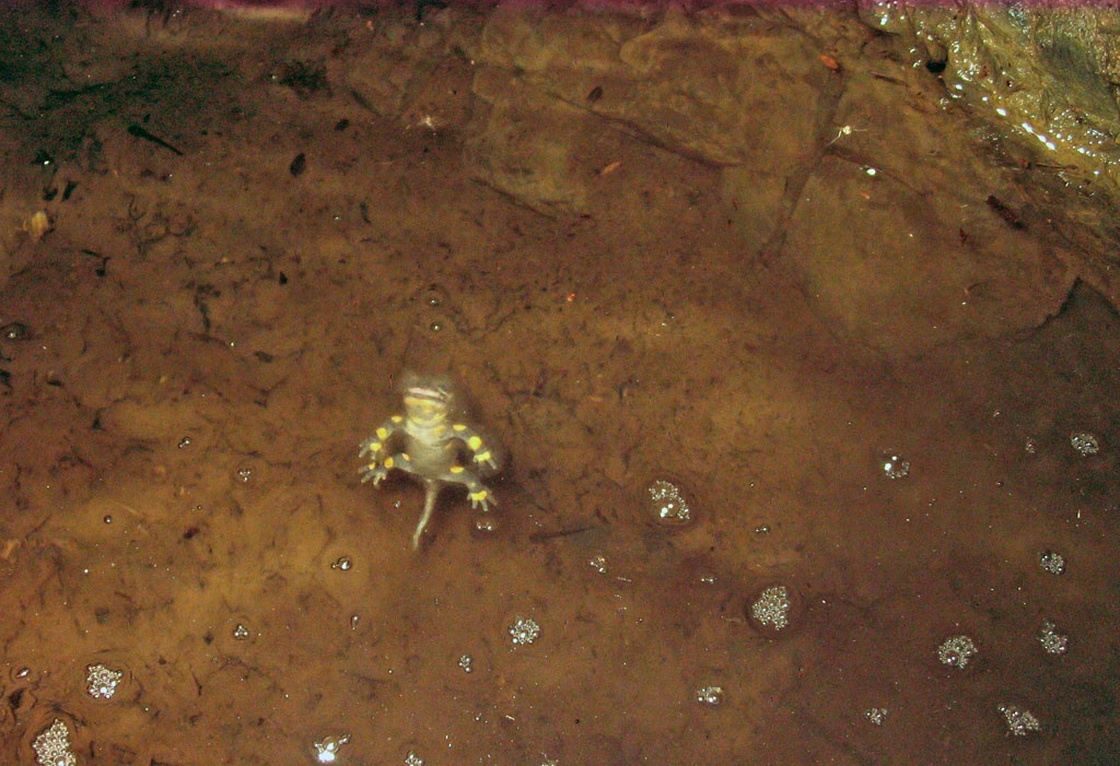 Nix vergessen und 5° Außentemperatur lassen die Unternehmung gut beginnen. Außerdem werden wir von einer Ansammlung von jährigen Feuersalamandern begrüßt, die nur noch von einem großen trächtigen Weibchen gekrönt wird.