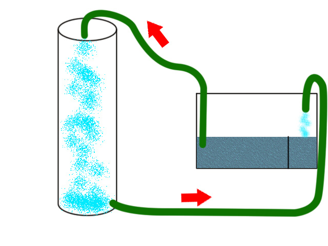 Beim Aquarium brauchen wir nur dafür zu sorgen, dass genug Luft über die Wasseroberfläche geführt wird. Durch seine eigene Verdunstung kühlt das Wasser ab, wobei die benötigte Energie nicht zugeführt werden muss, sondern eben die Aufwendung dieser Energie in thermischer Form aus dem Wasser selber die Kühlung verursacht. Somit wird also eigentlich nicht die Abkühlung durch Aufwendung der Verdunstung erzielt, sondern die Verdunstung durch Aufwendung der Wärme.