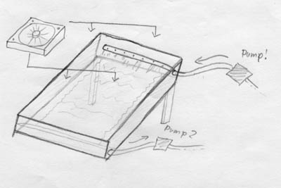 Kann man das Prinzip der Verdunstung nicht auch SO anwenden, das nicht soviel Wasser verloren geht? Nehmen wir man an, ich habe einen geschlossenen Plastikkasten mit ...hm... sagen wir mal den Maßen 50x40x5 cm. Wenn ich diesen in Schräglage aufstelle, 10" PC-Lüfter einsetze und auf der Innenseite Wasser durchlaufen lasse...(Oben rein, unten raus und flach über die ganze Innenfläche...,). WÄRE das dann nich auch das selbe Prinzip wie die Lüfter über den Becken aufzuhängen? Dadurch, dass sich alles in einem geschlossenem Systhem befindet, hoffe ich das "verfliegen" des Wassers zu verhindern...