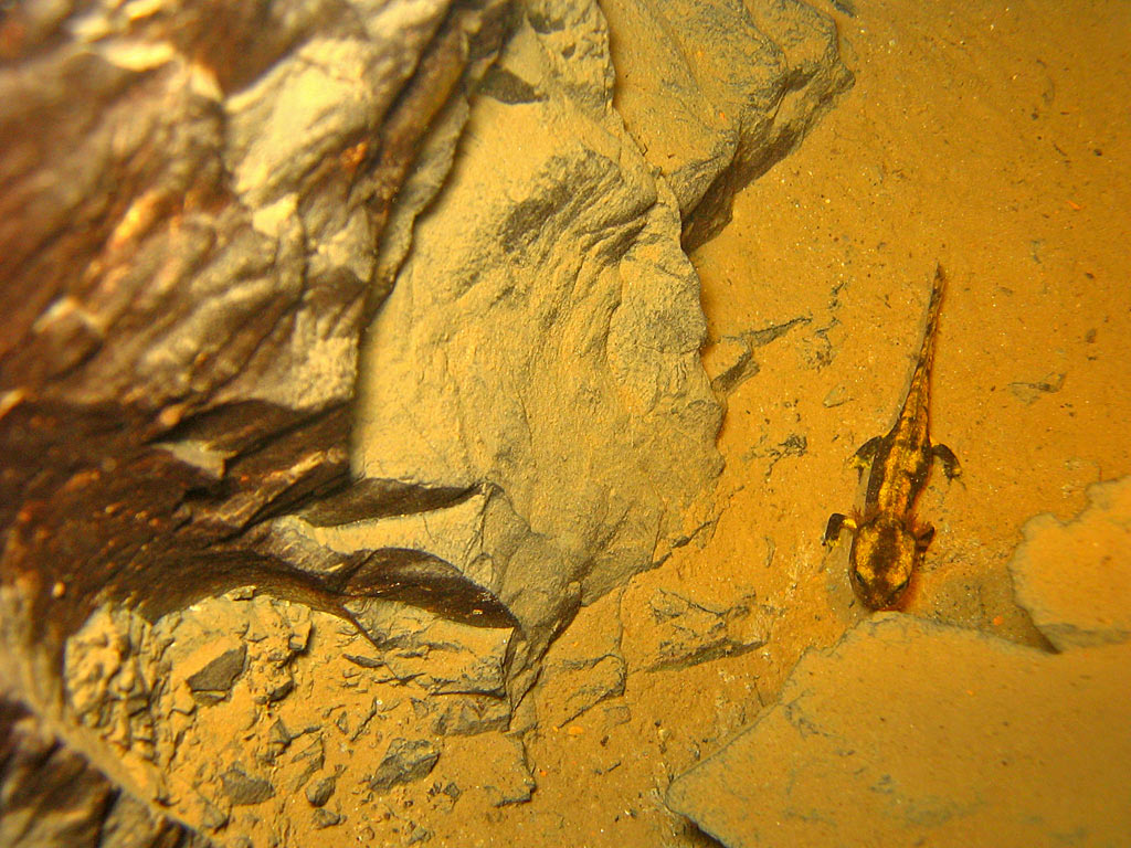 Außerdem bleibt anzumerken, dass unsere Helden recht munter unterwegs sind. Bis auf den am weitesten entwickelten Salamander (noch Larve?), der sich stur an der Ortsbrust aufhält, hat sein Konkurrent andere Nahrungsgründe aufgesucht, indem er ca. 30m Richtung Gesenk „gewandert“ ist und die Erdkröte konnte ich auf dem Hinweg nicht finden. Sie hatte sich in den kleineren anderen Stollenabschnitt verfügt und damit auch ca. 35m zurückgelegt. Erscheint mir etwas magerer als vorher.