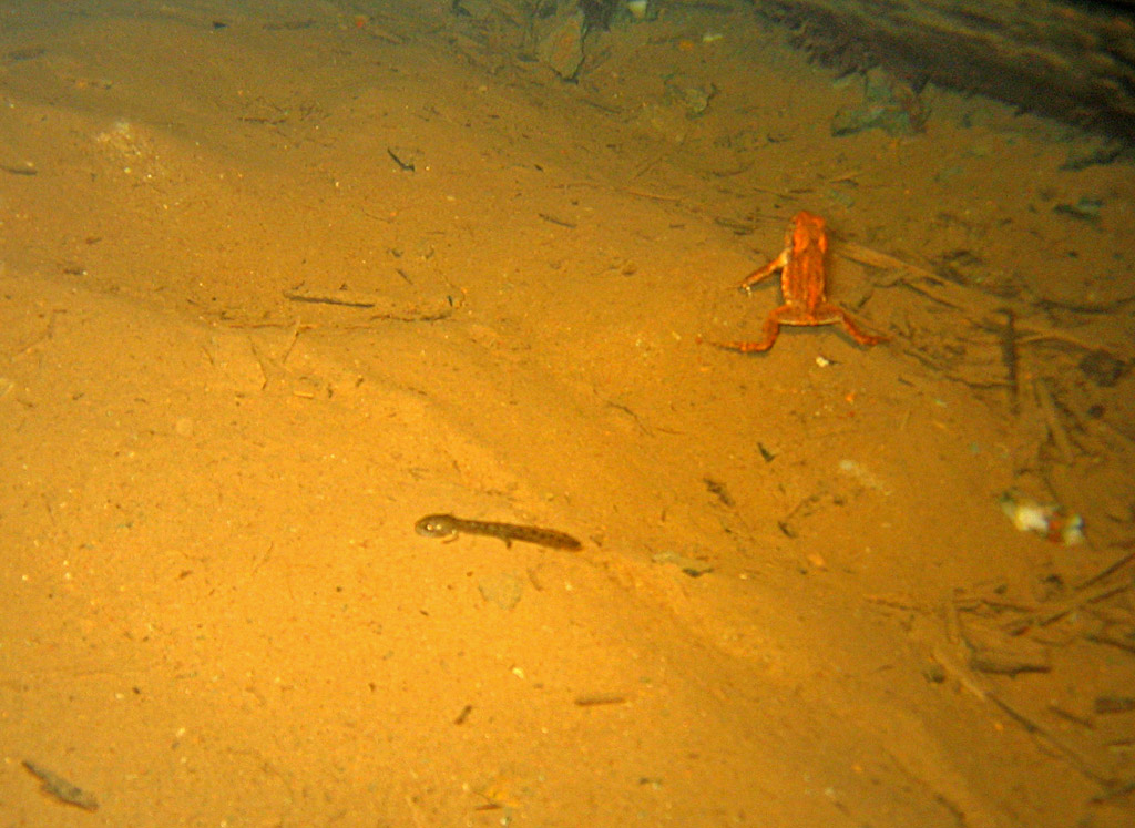 Außerdem bleibt anzumerken, dass unsere Helden recht munter unterwegs sind. Bis auf den am weitesten entwickelten Salamander (noch Larve?), der sich stur an der Ortsbrust aufhält, hat sein Konkurrent andere Nahrungsgründe aufgesucht, indem er ca. 30m Richtung Gesenk „gewandert“ ist und die Erdkröte konnte ich auf dem Hinweg nicht finden. Sie hatte sich in den kleineren anderen Stollenabschnitt verfügt und damit auch ca. 35m zurückgelegt. Erscheint mir etwas magerer als vorher.