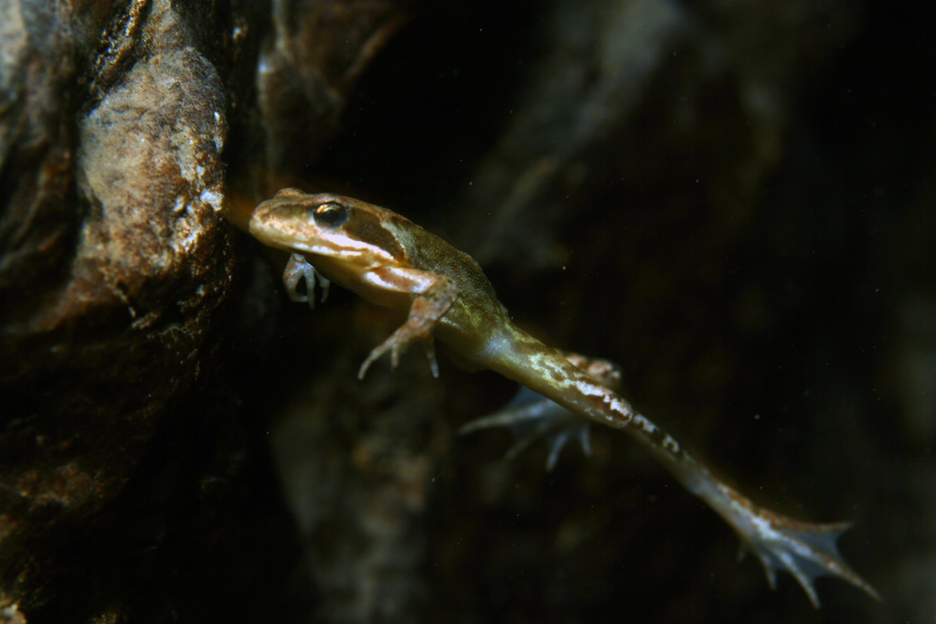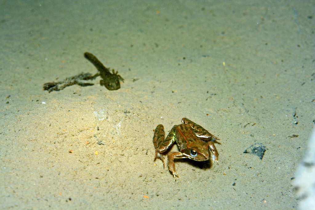 Dazu kam die kleine Runde der Grasfrösche, die immer noch zu viert (aber im Stollen verteilt) dort unten rumhängen. Keine Ahnung was sie dort wollen.