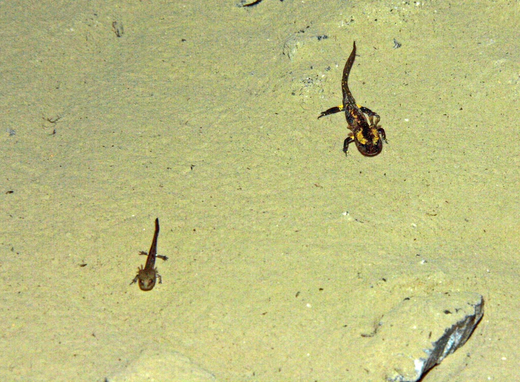 Aber einen neuen Rekord gilt es zu vermelden: 118 Larven und dabei ein neuer Anwärter bei 20m im langen Stollen, der wohl nur ein Einwanderer von oben sein kann, so groß wie er schon ist. Dafür fehlt der bisherige Thronfolger, der möglicherweise den Ausgang genommen hat und zufällig von mir (am 2.7.) kurz vor Erreichen des Flachbereichs auf 6m fotografiert wurde.
