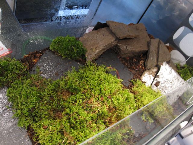 Ich habe mir nun doch noch ein 100er Aquarium gekauft und heute eingerichtet. Als Drainage habe ich Lavakies gewählt. Darauf Erde, Moos und Verstecke.