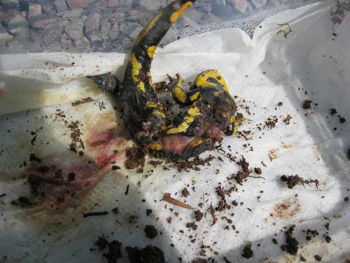 Doch dann der "Schock". im Abstand von einem Meter zwei adulte Salamander die noch lebten und auf den ersten Blick gesund aussahen, aber bei näherem betrachten wurde mir klar: der Bauch war "aufgeschlitzt" und sämtliche Organe ausgefressen. Sonst keine äußeren Verletztungen. Und wie gesagt: die Tiere leben noch und bewegen auch Kopf und Vorderbeine! Ich habe sie also mitgenommen (ich mache mir keine Hoffnungen das sie überleben, aber so kann ich sie wenigstens gebührend bestatten...), besser wäre wohl gewesen ihnen den Schädel zu zertrümmern aber das hätte ich nicht übers Herz gebracht...grausam.