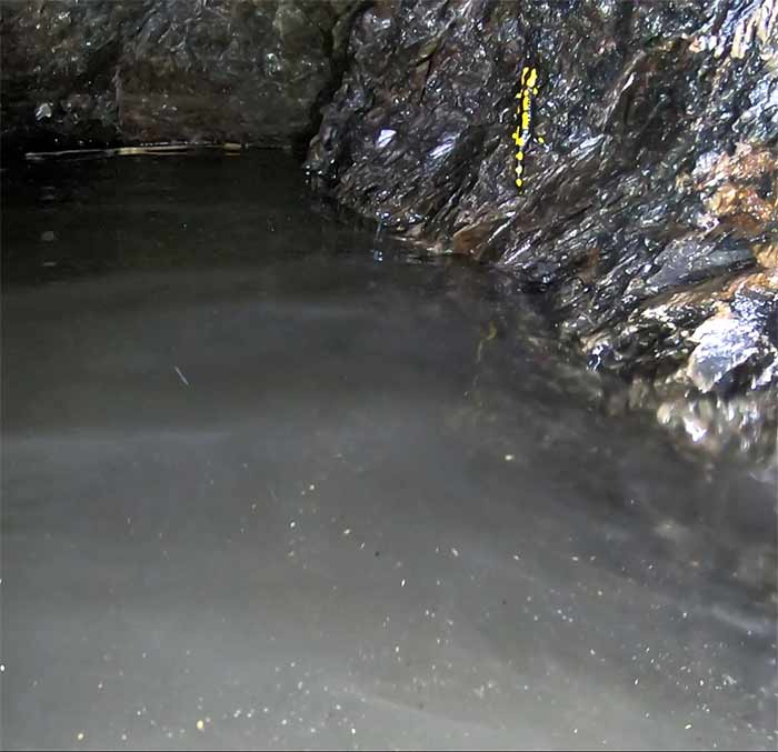 Ich bin dann umgekehrt und habe auf dem Rückweg noch einen größeren Salamander in der Luftglocke an einer schrägen Wandstelle (Stoß) gesehen, der dort saß. Die Beobachtungen zeigen, dass es auch adulten Tieren zuweilen nicht möglich ist, schnell steigenden Wasserständen zu entweichen und dass ihre Hautatmung nicht dazu geeignet sein kann, längere Zeiträume unter Wasser zu überleben. Trotzdem wird der Stollen regelmäßig von Feuersalamandern frequentiert.