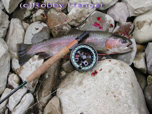 ..... Dabei habe ich eine Forelle 47 cm lange Regenbogenforelle gefangen, die schon fast Regungslos war. ....