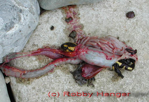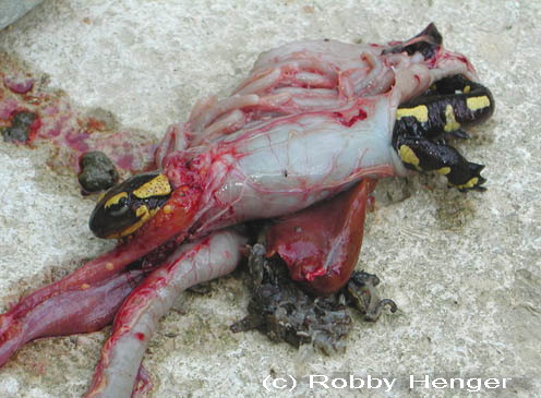 dies könnte Dich interresieren! Feuersalamander haben auch natürliche Feinde. Hier ein etwas ungewöhnliches Ereigniss. Gestern, am 17.05.06 war ich Fliegenfischen an der Wutach im Schwarzwald. Dabei habe ich eine Forelle 47 cm lange Regenbogenforelle gefangen, die schon fast Regungslos war. Als ich sie ausgenommen hatt und den Mageninhalt inspizierte kam ein 17 cm langer Feuersalamander zum Vorschein. So etwas habe ich noch nie gesehen. Im Anhang die Bilder.