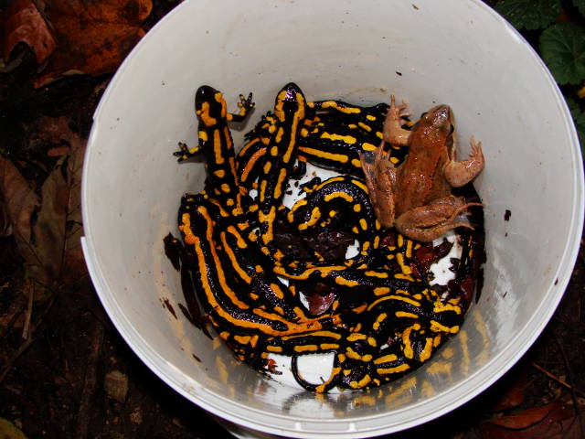 vielen Dank für Euer Engagement !! Bis jetzt sind es über 600 Tiere von einer wirklich großen Population, die einem öffentlichen Projekt weichen muss. Bei unserem letzten Rundgang am Freitag, bei ganz leichtem Schneefall, fanden wir 150 Salamander in ca 3Stunden (das war der weisse Eimer, Bild 018 - in dem Eimer sind sage und schreibe 150 Salamander),
