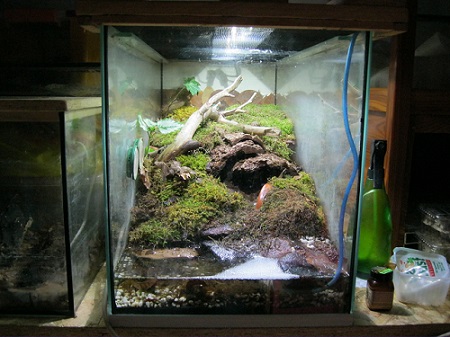 Die Pflanzen (eine kleine Buche, Efeu und eine Pflanze aus dem Wald :D ) wachsen sehr gut, das Licht ist sehr angenehm und die Tiere sogar manchmal bei eingeschalteter Beleuchtung außerhalb ihrer Verstecke zu beobachten. Ich habe bisher komplett auf farbige LEDs verzichtet (auf die UV-LEDs erst recht, da diese wohl wirklich eher schaden als nutzen).