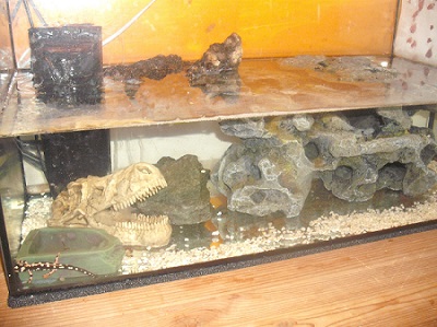 60er Becken, Gaze Abdeckung, Steinaufbauten mit div. Versteckmöglichkeiten. Anfangs hatte ich Kies drin, da sich aber die blöden Mückenlarven dort sehr schnell vergraben und die Posthornschnecken, die mit im Becken sind auch keine guten Buddler sind, habe ich den Kies raus und nur minimal etwas Kies drin, so das jedes Futtertier auch gefunden wird ;-) Da die Kaiseri keine Strömung mögen, hab ich als Filterung einen EasyCrystal Filter250 von Tetra drin. Manchmal sitzen die Molche ganz begeistert oben drauf im "Wasserfall" und scheinen es zu genießen wie das Wasser über sie drüber läuft :D